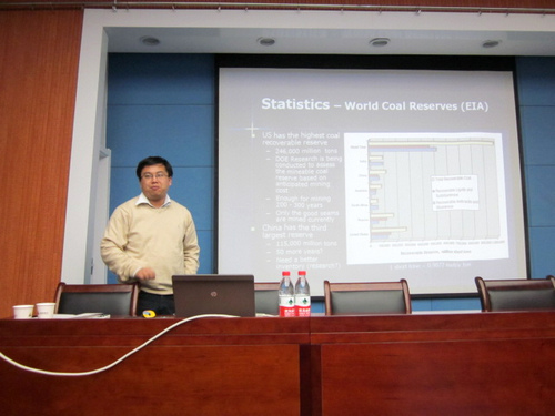 程老师全程用英文PPT进行讲解。讲座共分为四大部分:“程老师的个人研究成果”、“美国矿业概述”、“美国的煤矿专业教育”及“申请出国留学”。程老师首先介绍了美国的采煤方法,重点讲解了房柱式开采方法,指出了美国的开采功效高、煤炭运输方便且煤矿死亡率较低等特点。在美国煤矿教育方面,他介绍到,全美共有13所高校设有煤矿专业,大部分是本科教育。并就13所高校有关采矿和安全通风方面的研究情况向大家作了详细介绍。