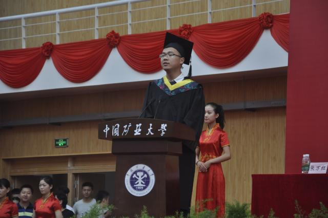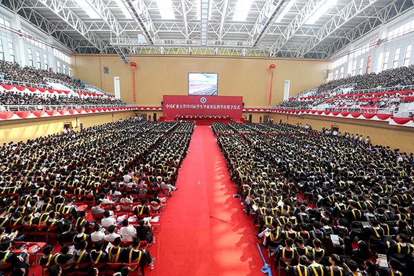 “太行之阳河水东,莘莘学子救国重劳工。源深流自远,物阜民用丰。山葱葱,水溶溶,努力,努力!行健天同功。”全体师生一起高唱《中国矿业大学校歌》,毕业典礼在高昂的歌声中落下帷幕。