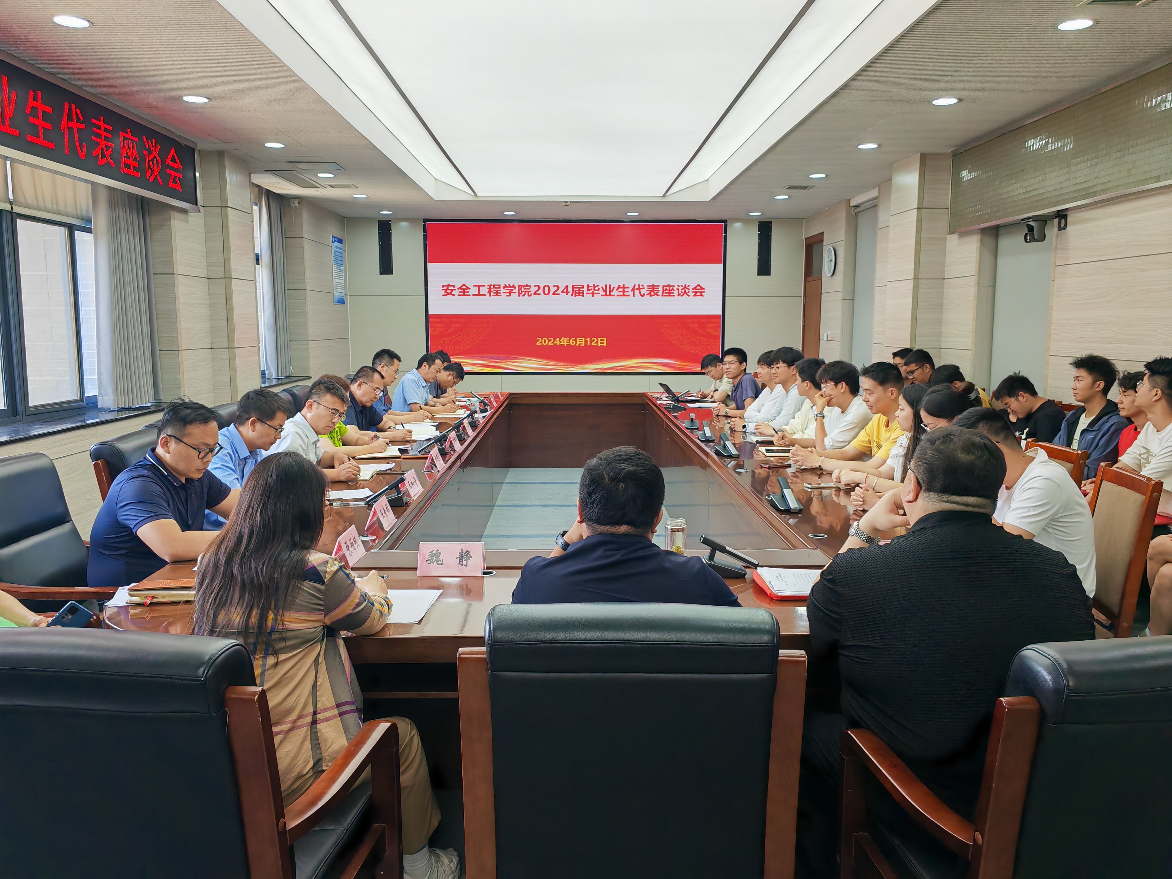 在矿业科学中心A412举行2024届毕业生代表座谈会。院党委书记王恩元,院长翟成,副院长郭梅香、刘晓斐,2024届本科生班主任,相关科室负责人及部分毕业生代表参加此次会议。座谈会由院党委副书记孙留涛主持。