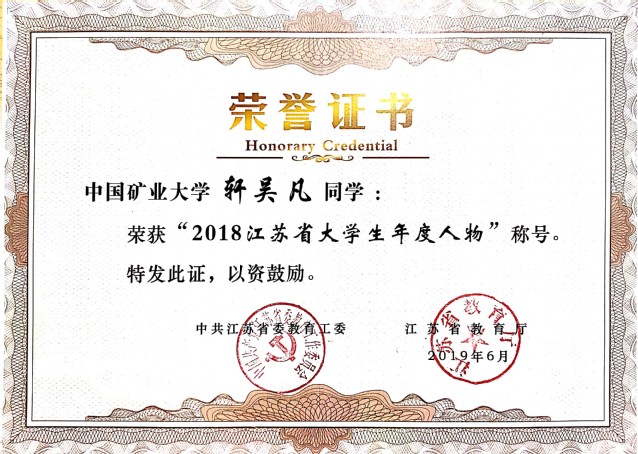 本科生轩吴凡荣获“2018江苏省大学生年度人物”称号。