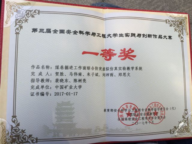 裴晓东、陈树亮老师指导,贺胜等人完成的《煤巷掘进工作面综合防突虚拟仿真实验教学系统》获得全国一等奖;由安全新澳门六合彩预测