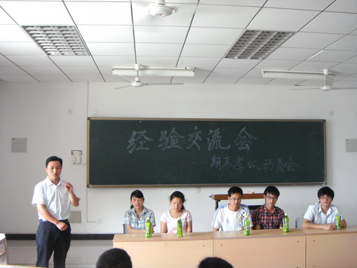 6月13日下午两点半,安全09-4班于教五C201举行了“经验交流会——期末考试动员会”。交流会由班主任唐俊老师主持,06级刘辉辉、韩文彬、张远娇、薛毅和季淮君五位同学作为嘉宾参加了此次经验交流会。