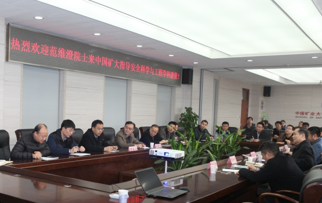 领导及教师就安全科学与工程学科发展进行座谈交流。范维澄院士结合自己在中国科技大学火灾科学国家重点实验室和清华大学公共安全研究院的工作经历,对矿大安全学科发展提出了指导意见。他说,中国矿业大学在矿业、安全方面的研究目前处于国际领先地位,安全学科的发展要守住已有的、非常重要的煤炭领域,面对煤矿开采越来越深、湿度大、温度高、环境恶劣,更要坚持做好相关的基础科学研究工作,继续为国家和煤炭行业提供重要的理论和技术支持;矿大的安全学科发展也要适当向公共安全领域延伸拓宽,结合教育部学位中心第四轮学科评估,可选择性地增设二级学科,尤其要加强不同学科之间的交流和思想碰撞,在不断的相互交流中产生新点子、新思想;抓住机遇加强“互联网+”在安全科学领域的应用,为政府和煤矿监管部门提供重要信息;发挥学科全国领先的优势,积极参与公共安全产业化发展及相关设备研发。
