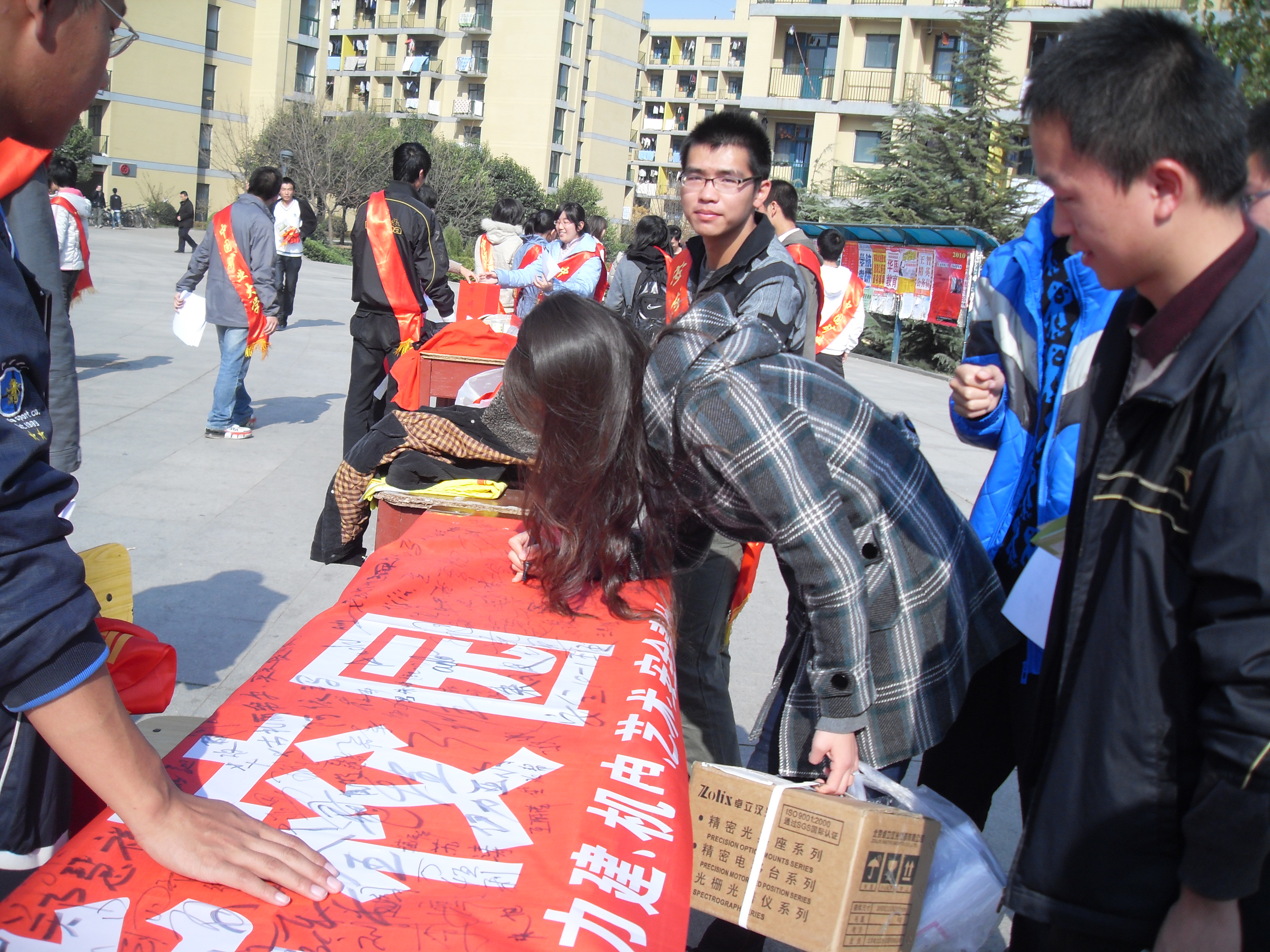 活动的开始,志愿者们将精心制作的宣传安全知识的宣传板置于二食堂广场,借此来提醒大家平时应多注意安全问题。 其中包括驾驶机动车、骑自行车、乘坐公共汽车以及在校园中停放自行车时等应注意的事项,形式活泼的的宣传板报吸引了很多路过的同学驻足观看。随后,志愿者们向路过的同学发放关于校园安全的传单并耐心地向他们介绍了校园安全对在校大学生的重要性,部分负责宣传的志愿者还告诉了同学们解决平时生活中的常见的一些安全隐患的方法。同学们也纷纷表示会更加注意校园的安全问题。志愿者们还邀请参加本次活动的同学们在活动的宣传条幅上签下自己的名字,从而来坚定自己以后要时刻注意安全问题的决心。