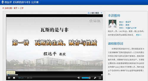 教授程远平、王德明、林柏泉主讲的精品视频课程《瓦斯的是与非》在“爱课程”网站上线。“爱课程”网是教育部、财政部“十二五”期间启动实施的“高等学教育课程资源共享平台。目前我校已有两门课程在该网站上线。