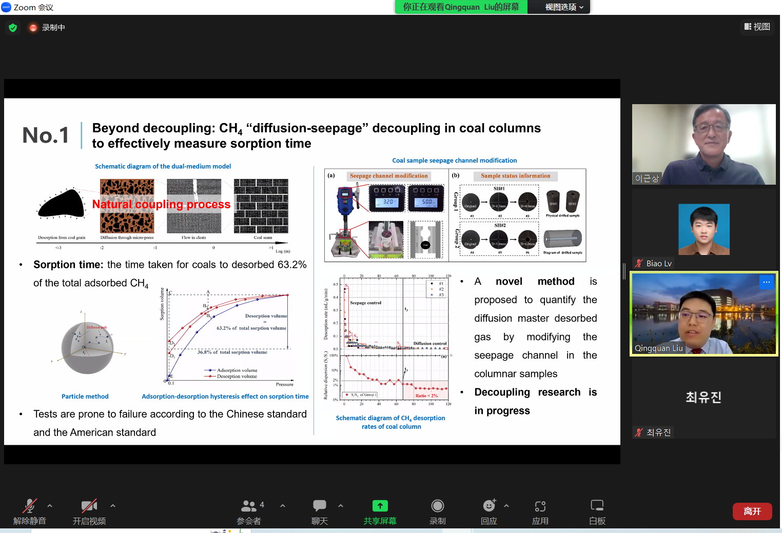 刘清泉副教授介绍了团队的人员及实验仪器情况,分享了“基于煤层瓦斯扩散-渗流解耦的吸附时间测定理论与方法”“考虑脱附扩散迟滞影响的煤层瓦斯流动模型”等最新研究成果,并围绕非常规储层流体运移数值模拟及软件开发与Kun Sang Lee教授展开研讨。