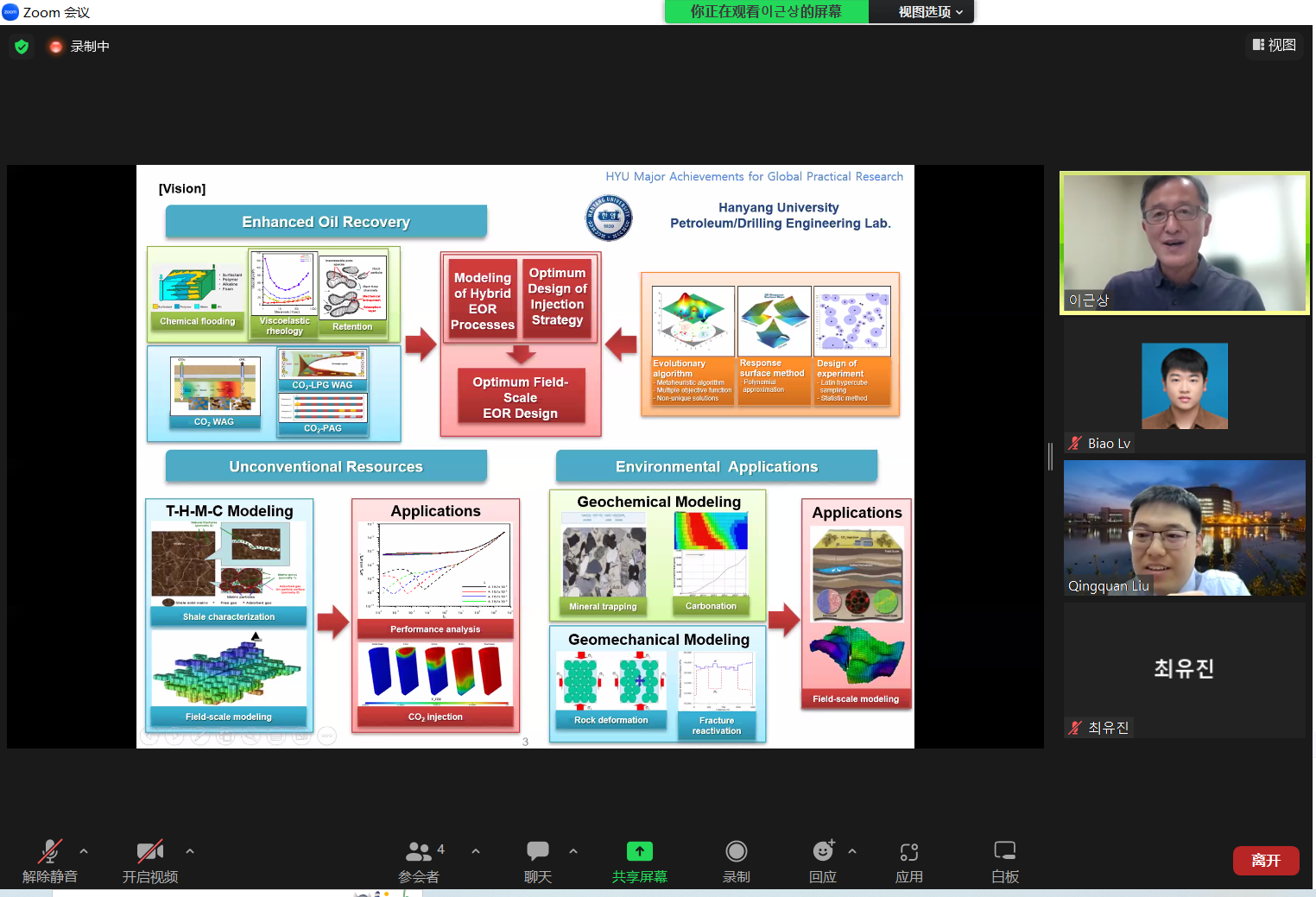 的发展历史,重点介绍了自己的三个研究方向“Enhanced Oil Recovery” “Unconventional Resources”及“Environmental Applications: CCS, UTES”,分享了团队前期在油藏CO2驱油提高采收率、CO2致裂页岩等方面的研究成果,并诚挚邀请刘清泉副教授及团队成员来汉阳大学访问交流。