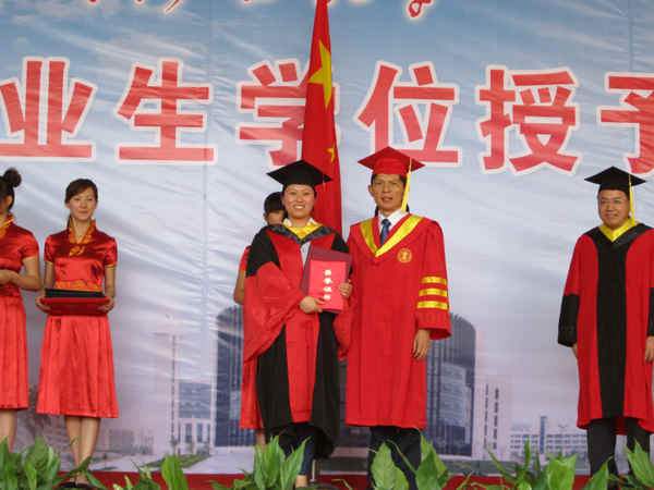 毕业生们便陆续上台,由袁亮院长亲自颁发学位证书。毕业生们手持学位证书与副校长宋学峰及袁亮院长合影留念。随后,他们又与校众多领导握手告别。整个仪式庄严而又充满喜悦。最后,大会在全场热烈的掌声和欢声笑语中顺利结束。