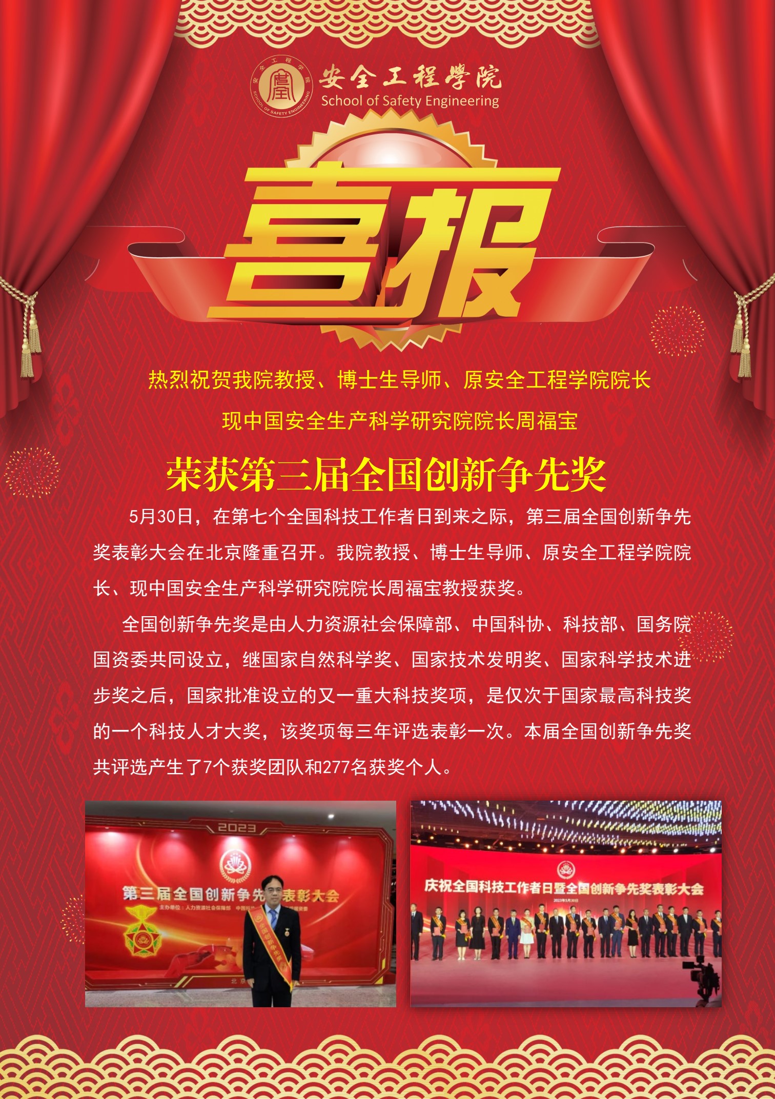 热烈祝贺新澳门六合彩预测 教授、博士生导师、原新澳门六合彩预测 院长、现中国安全生产科学研究院院长周福宝教授荣获第三届全国创新争先奖