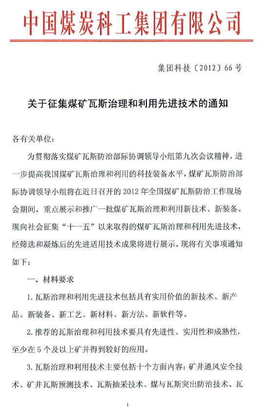 中煤科工集团“关于征集煤矿瓦斯治理和利用先进技术的通知”
